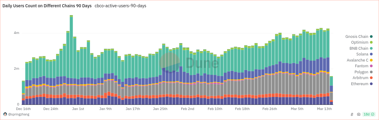 “Аддитивность” слоёв очень важна. Так например по графику ниже создаётся первоначальное впечатление, что Ethereum сильно отстаёт от BNB и Solanа, однако, если суммировать то, что называется L2 ETH, то выходит, что Ethereum идёт наравне с BNB. Таким образом чемпионские 40 миллинов транзакций в день в Solana заставляют только усомниться в их честности.