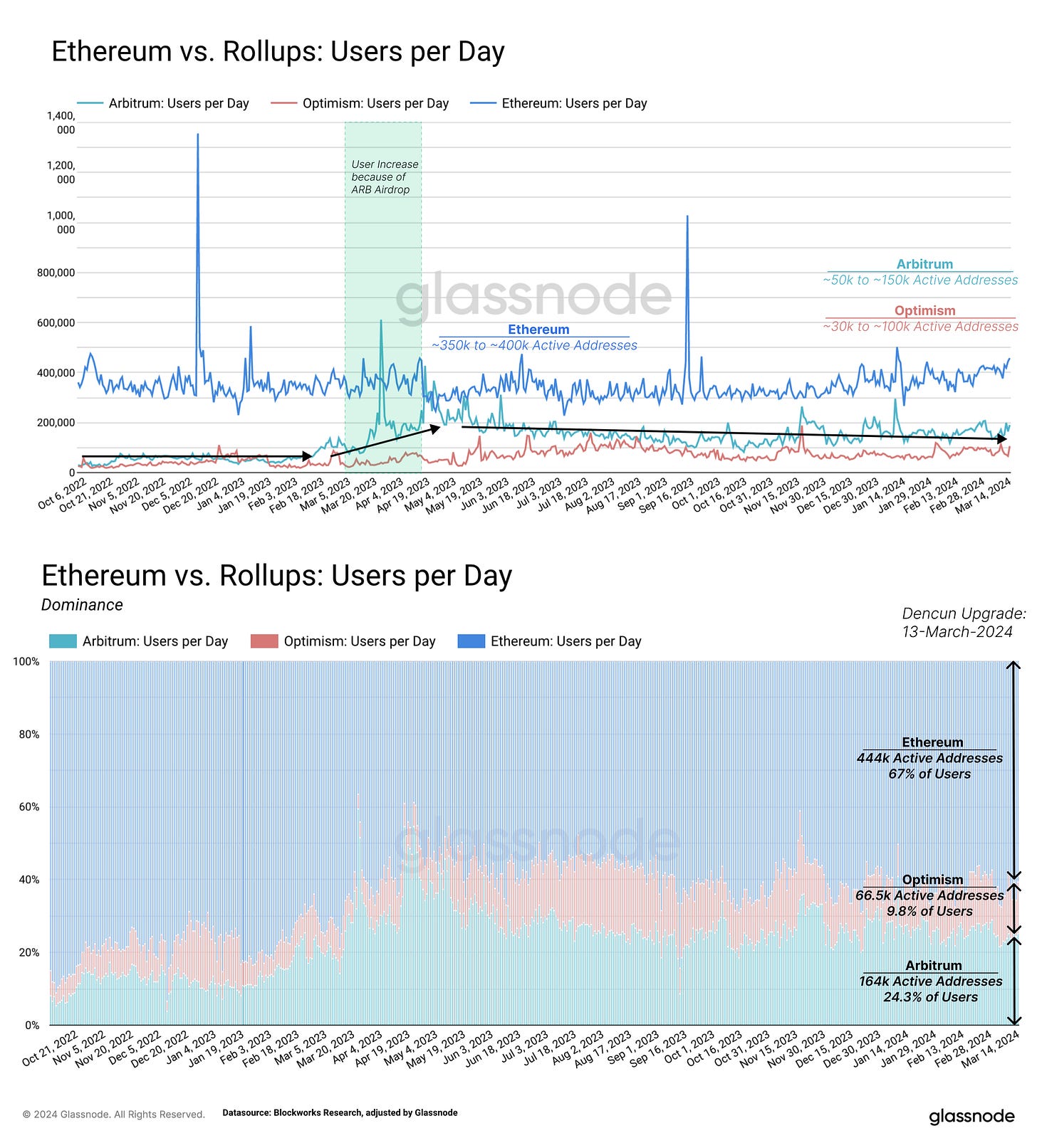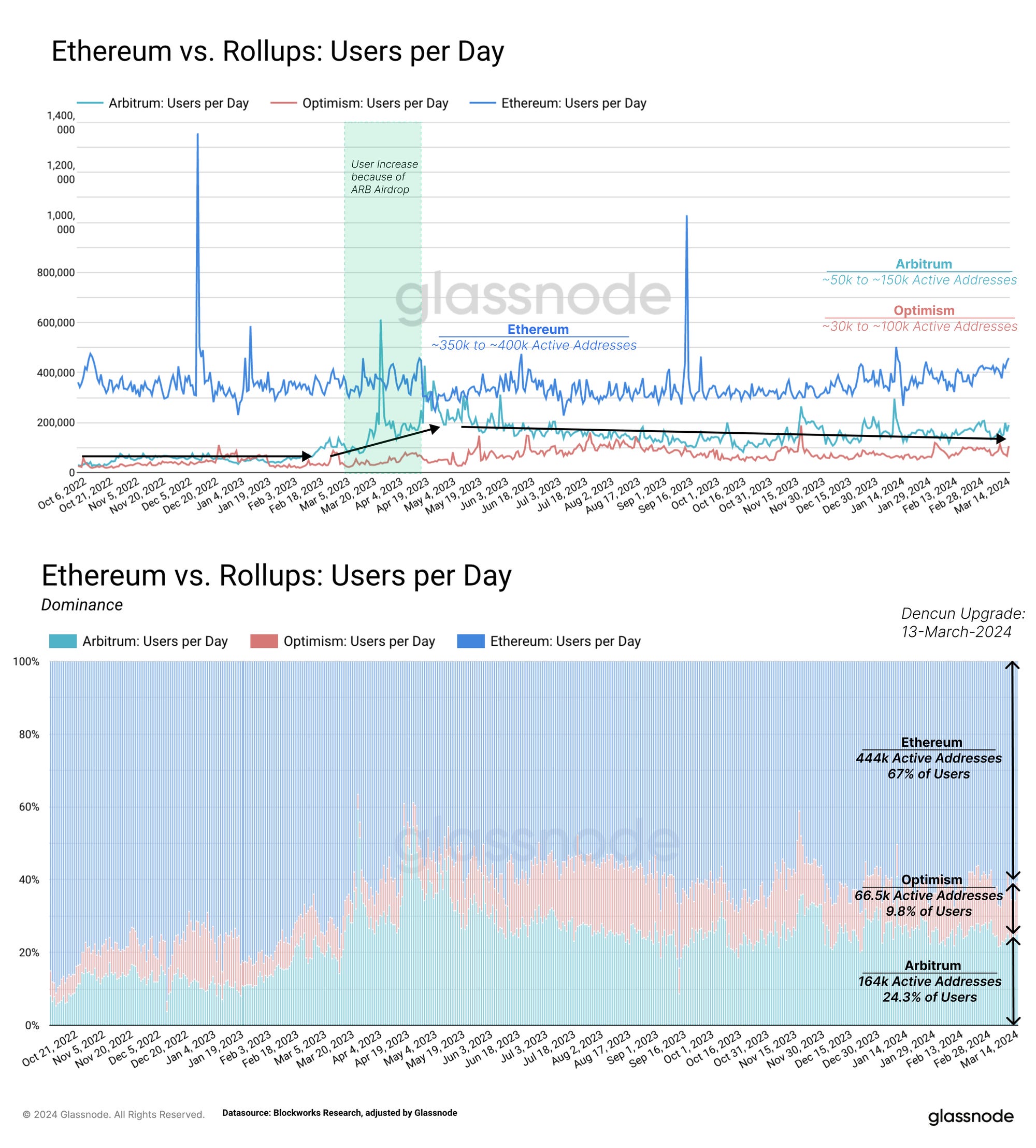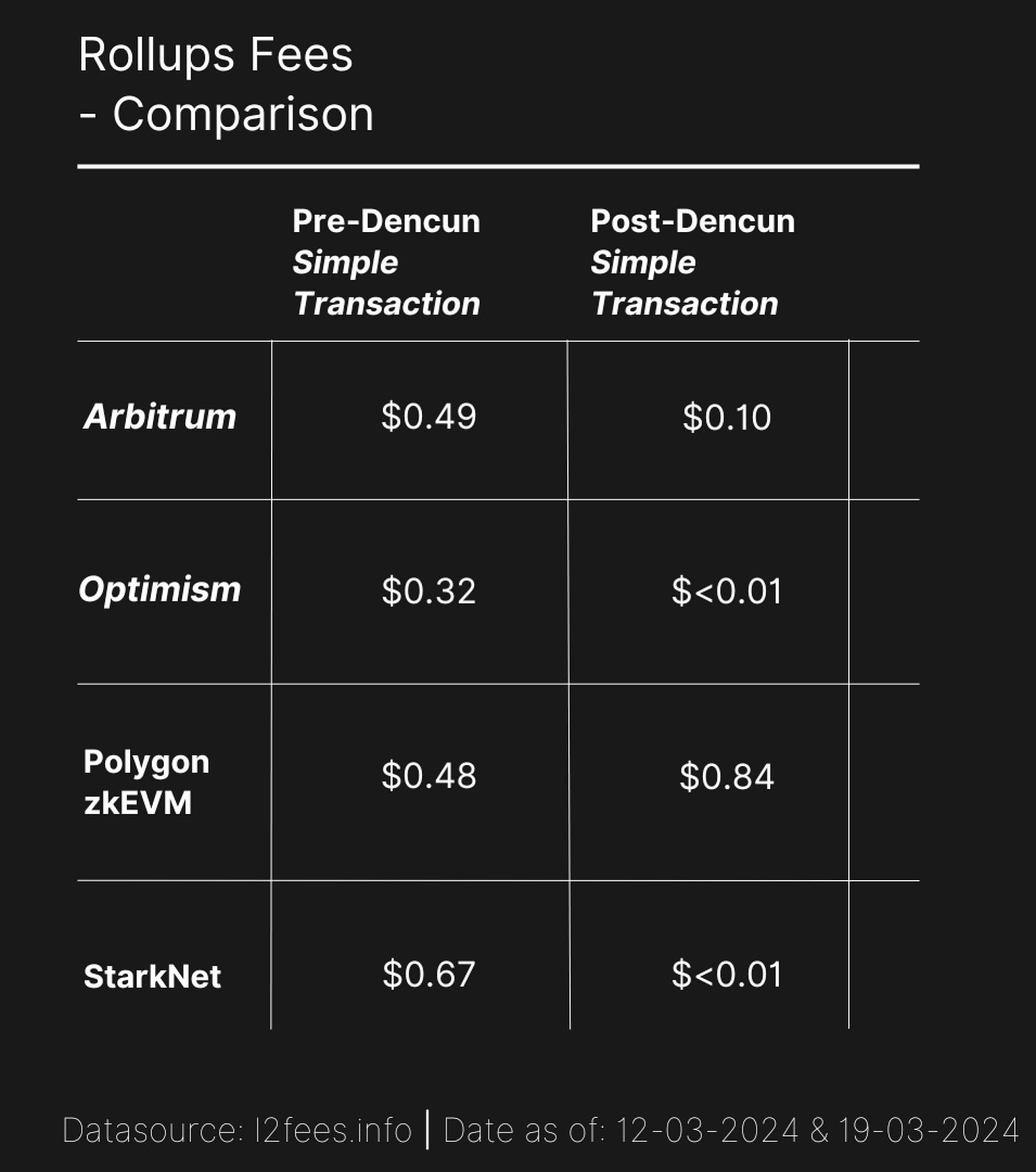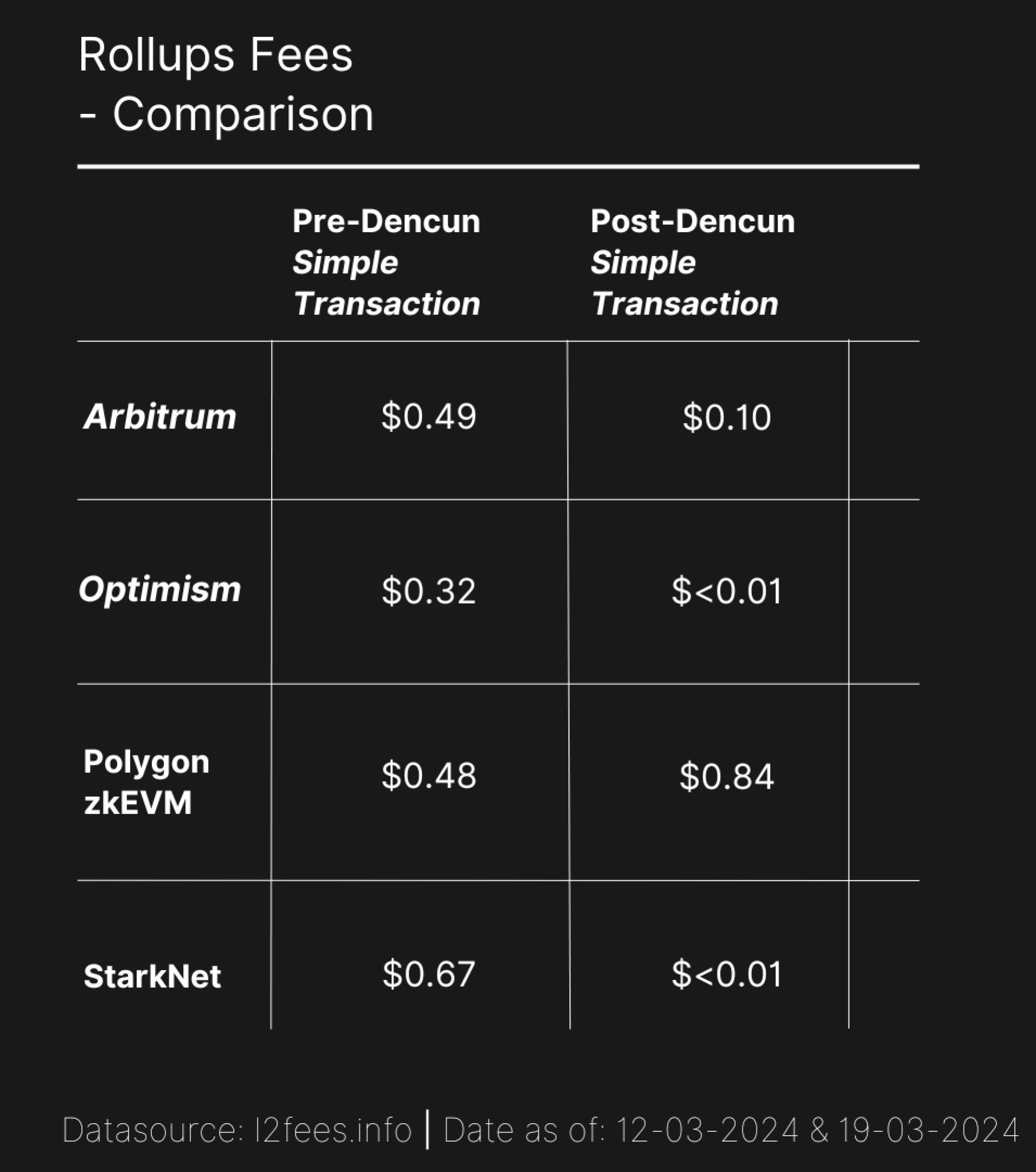 В то время как реальные метрики освоения являются действительно важными сейчас, и отражают наличную ликвидность, важным условием продолжения работы и будущего успеха является только стоимость совершения транзакции. Dencun снизил уровень комиссий в L2 ETH для некоторых решений в десятки раз.