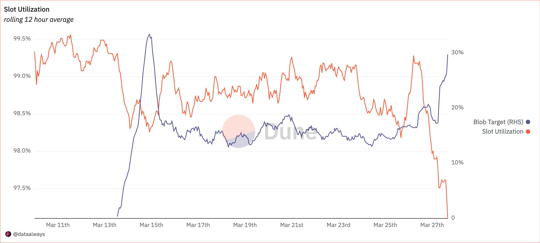 Следующий график прямо указывает на связь роста коммитов данных роллапов в блоки ETH и снижение метрик использования слотов — т.е. очередных вакантных номеров для блоков. Интервал между блоками также вероятно возрос на десятые доли секунд, необходимо накопить больше данных после хардфорка, чтобы проследить зависимость по временной шкале.